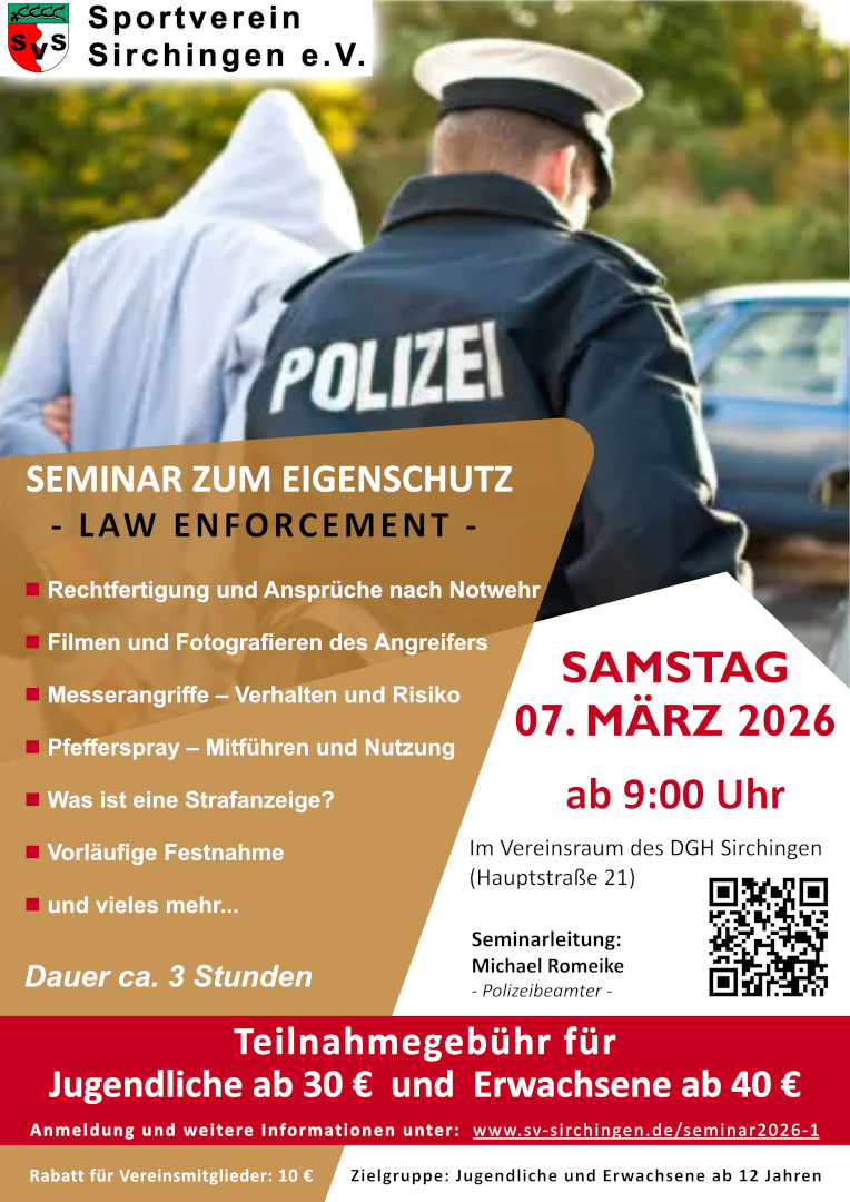 Am Samstag 07. März 2026 findet in Sirchingen ein Selbstverteidigungsseminar für Jugendliche und Erwachsene (ab 12 Jahren) statt.